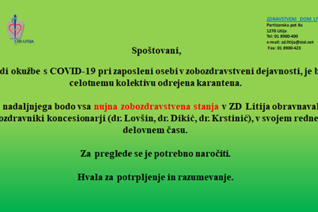 Zaradi okužbe s COVID-19 pri zaposleni osebi v zobozdravstveni dejavnosti, je bila celotnemu kolektivu odrejena karantena. Do nadaljnjega bodo vsa nujna zobozdravstvena stanja obravnavali zobozdravniki koncesionarji (dr. Lovšin, dr. Dikić, dr. Krstinić), v svojem rednem delovnem času. Za preglede se je potrebno naročiti. Danes, dne 13.1., je za nujna stanja odgovorna ambulanta dr. Lovšin.