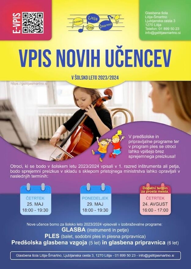 Na spodnji povezavi si lahko ogledate informacije o vpisu v Glasbeno šolo Litija – Šmartno https://gslitijasmartno.si/vpisi-ucencev-in-ucenk-v-solsko-leto-2023-24/