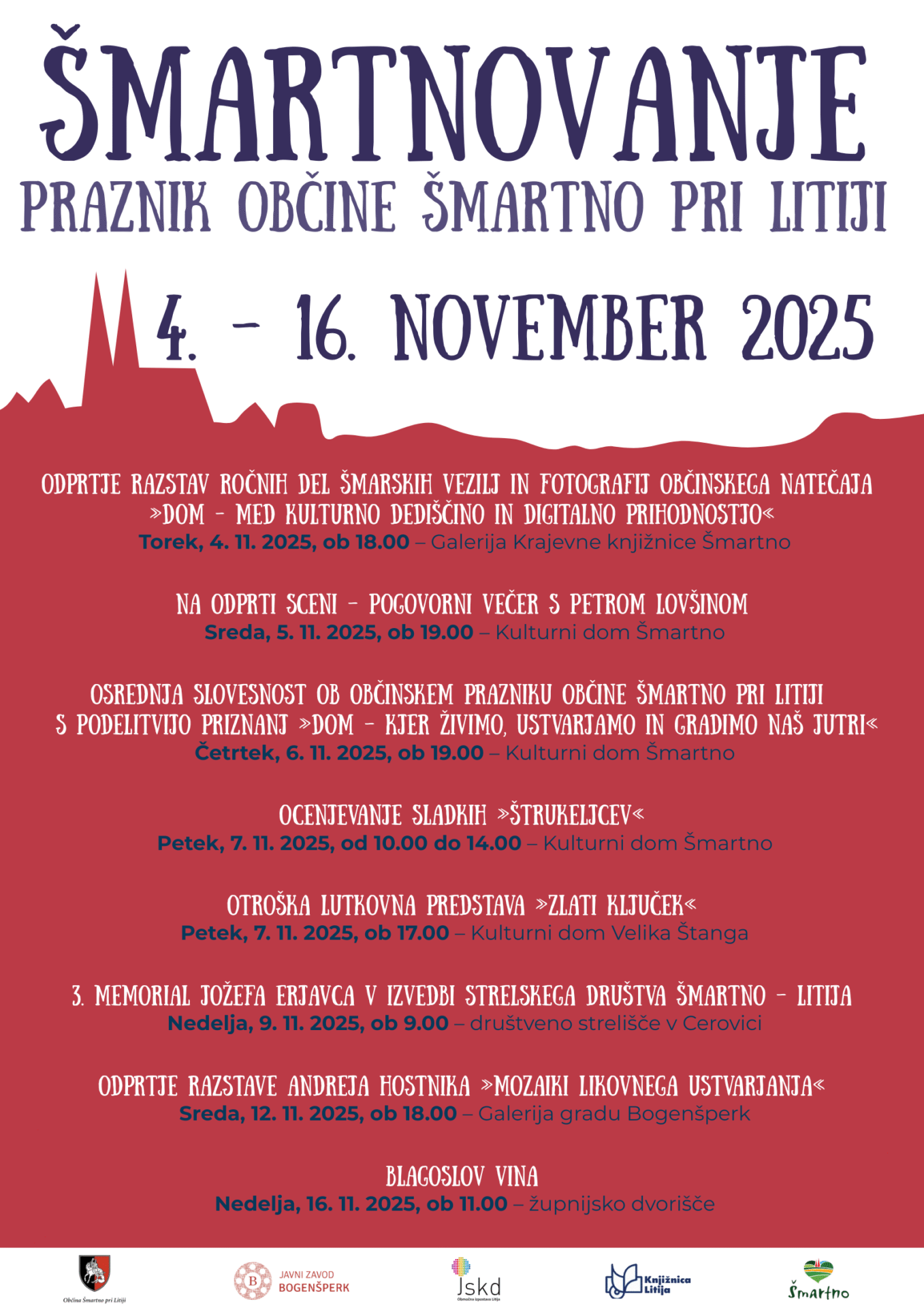 Osrednja slovesnost ob občinskem prazniku občine Šmartno pri Litiji s podelitvijo priznanj »Dom – kjer živimo, ustvarjamo in gradimo naš jutri«, četrtek, 6. november 2025, ob 19.00 v Kulturnem domu Šmartno pri Litiji